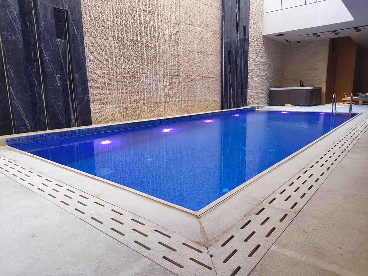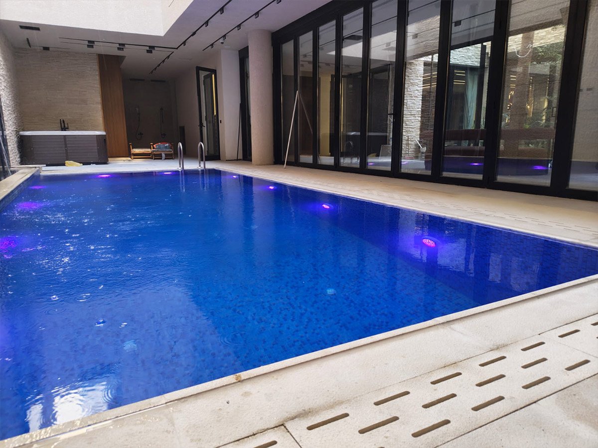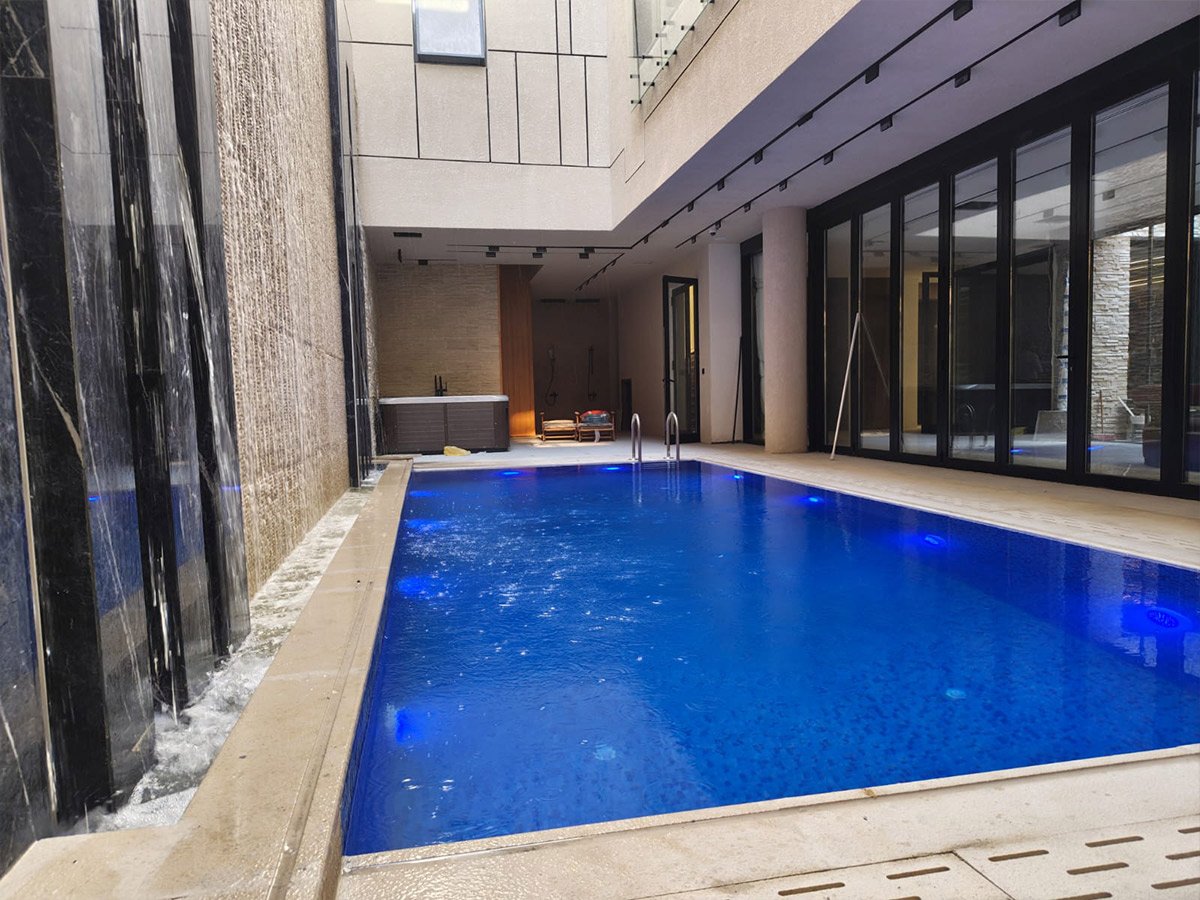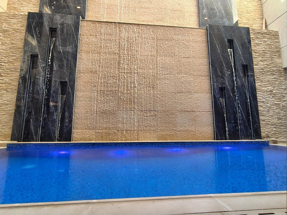 قدّمت صفوة المسابح تحفة مائية فريدة داخل فيلا خاصة بالرياض، تجمع بين الفخامة والدقة الهندسية. يتميّز المشروع بشلالات بارتفاع 12 متر تضيف حركة ديناميكية مبهرة، مع نظام إضاءة إسباني أنيق يعزز جمال المياه في الليل.